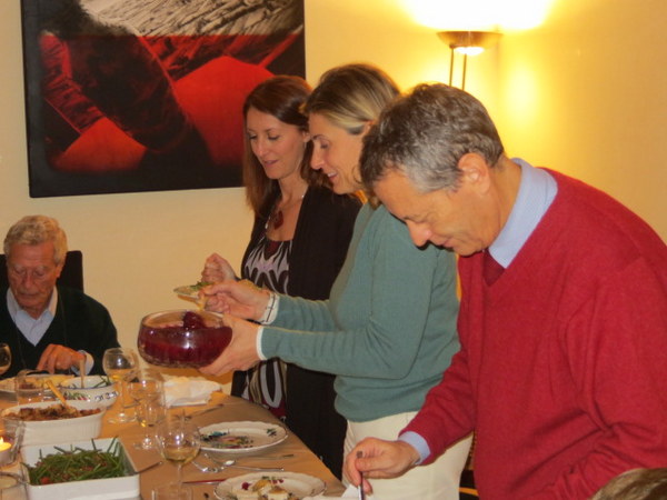 Whew! Deep breath, now all we have to do is monitor, baste, add broth, and prepare the contorni. Ric is a terrific sous chef and spent the next hour carving up butternut squash for soup, peeling potatoes, and various other tasks assigned, while the kids came and went. All-in-all Alessandra, Ric and I spent a compatible couple of hours doing prep, setting the table, chatting and enjoying the time immensely. At each check on the turkey, I worried it was getting too brown, but my research on roasting a turkey in a convection oven said do not cover with foil. By 17:30 I was nervous: it looked done. My brand new meat thermometer (Celsius, of course!) said it was done in most parts. Can’t be! Two hours at 160C (325F) and it’s done!?!?!? The main event was still 3 hours off! We wanted the guests to see this magnificent beast, but how could we hold it safely not have it dried out like the scene from “Christmas Vacation?”