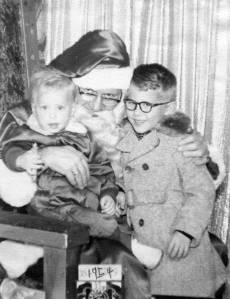 My first Christmas, 1953, pictured with my big brother, Rick, and our dachshund, Peter, at Grandma & Grandpa’s house.