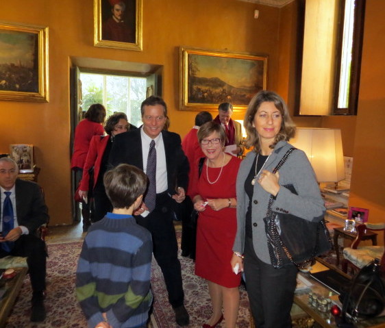 Leo (back to camera), Francesco, and Alessandra – with me in the middle – enjoy one of the elegant salons at Villa Aurora.