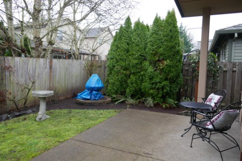 The backyard will be transformed starting next week as I am killing the grass. The blue tarp covers a fountain.