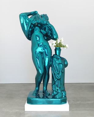 We loved the dinosaur installation for its whimsy, but also for a message about “stuff” and the propensity to collect, or more specifically to hoard. Michele Abeles’ “Flag Flag Flag” is strikingly displayed, and Jeff Koons’ turquoise polychrome Venus Antiquity took my breath away, but the empty chicken coop and flashlight left me shaking my head.