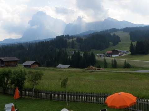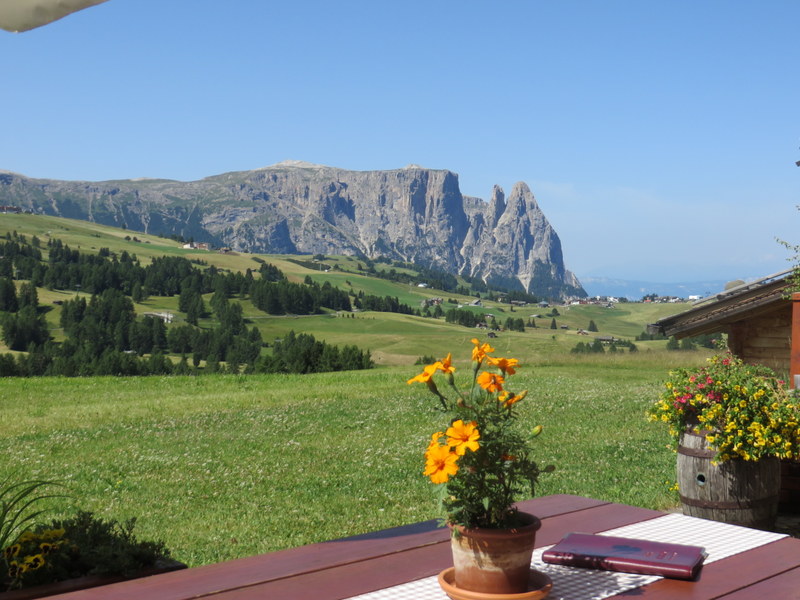 We have fond memories of our Christmas Day hike, so we did about half of it, returning to Mont Seuc after coffee at Hotel Icaro. It was an easy hike across to Icaro. We returned via Sole so we could take the chairlift to make an easy morning. Lots of people out, and thank God it was cooler due to rain the night before. In fact, we had a terrific thunderstorm. We would have expected at least two each week, but only had one good one. No doubt a result of the wacky summer weather: climate change in action. I am worried for our planet.